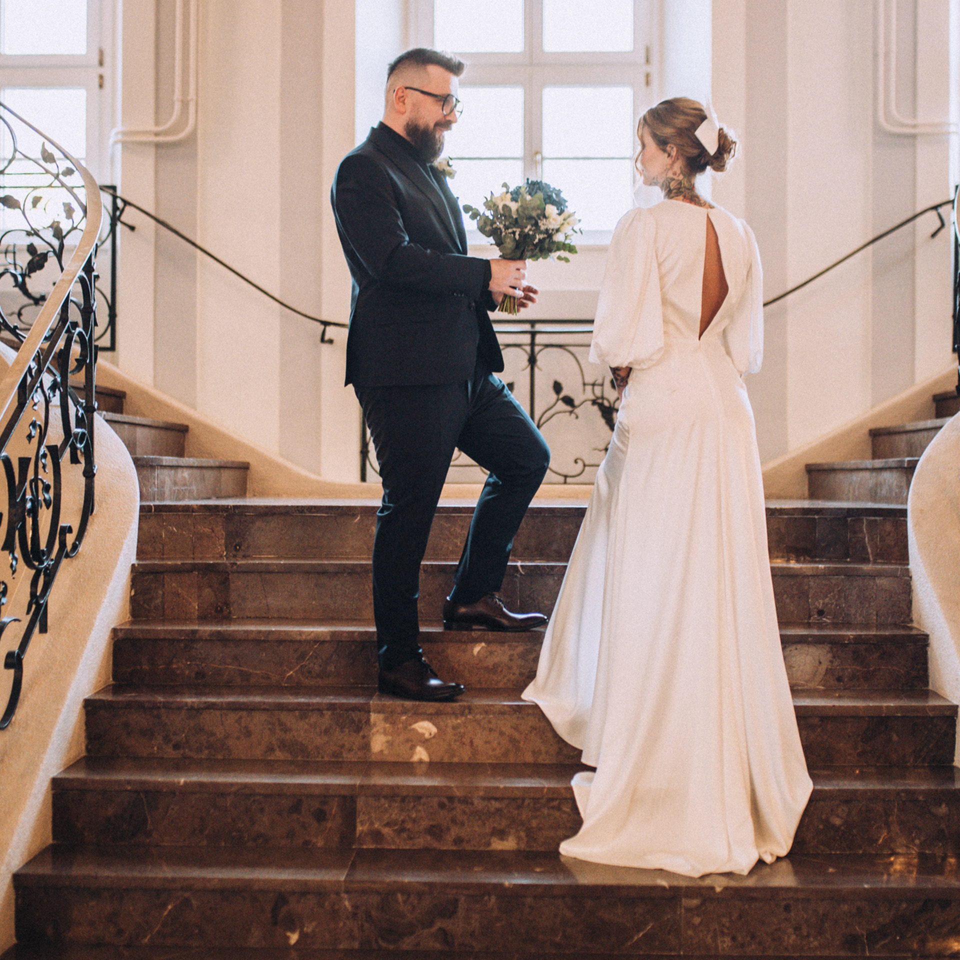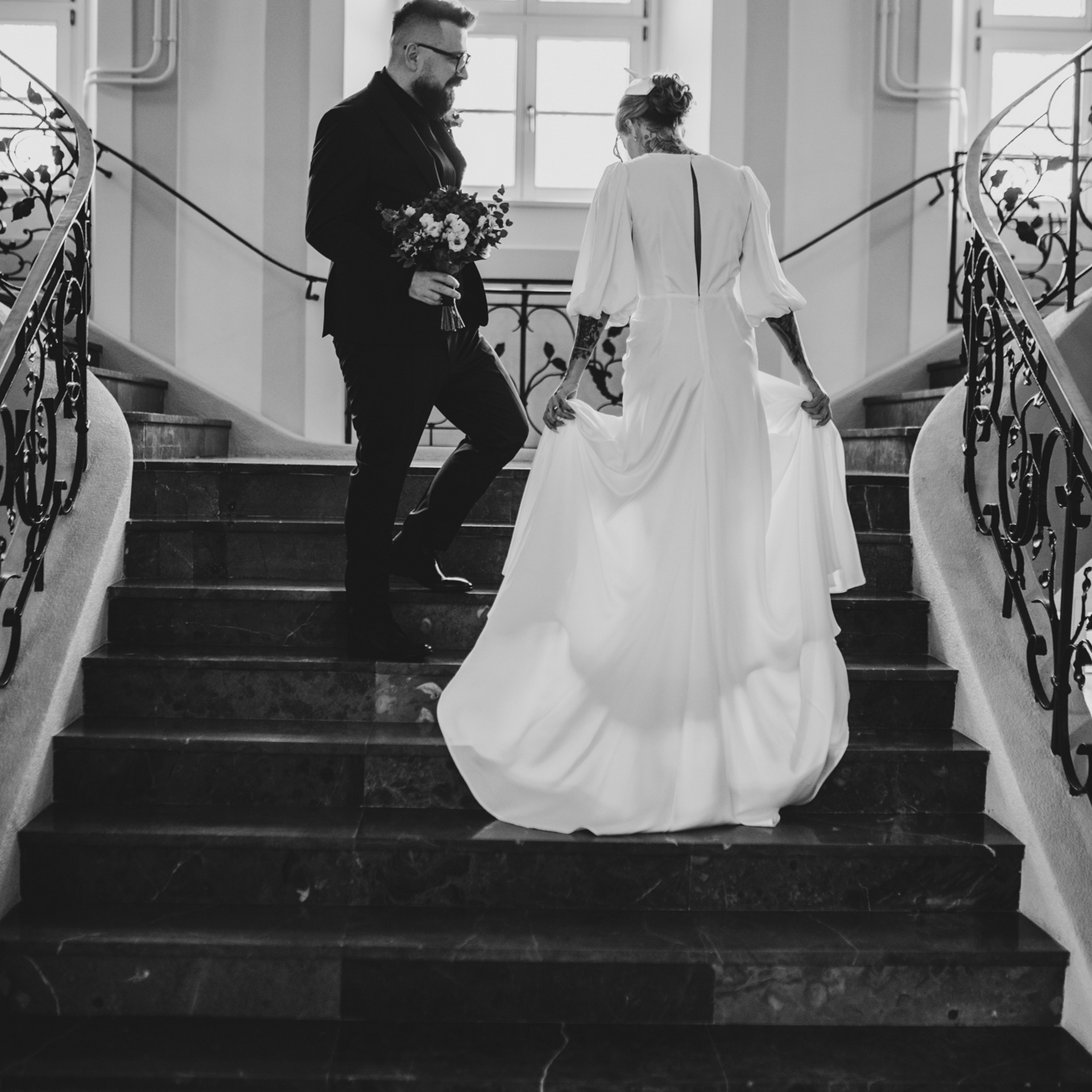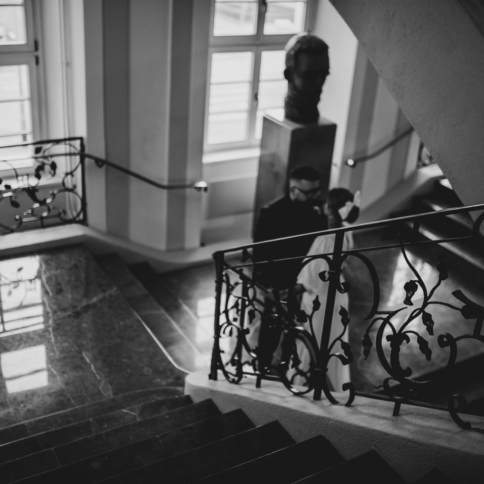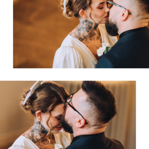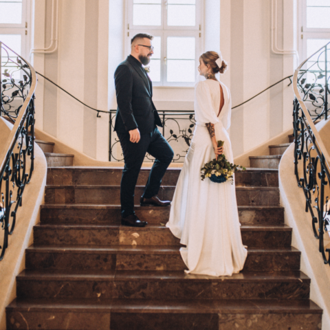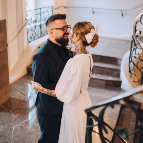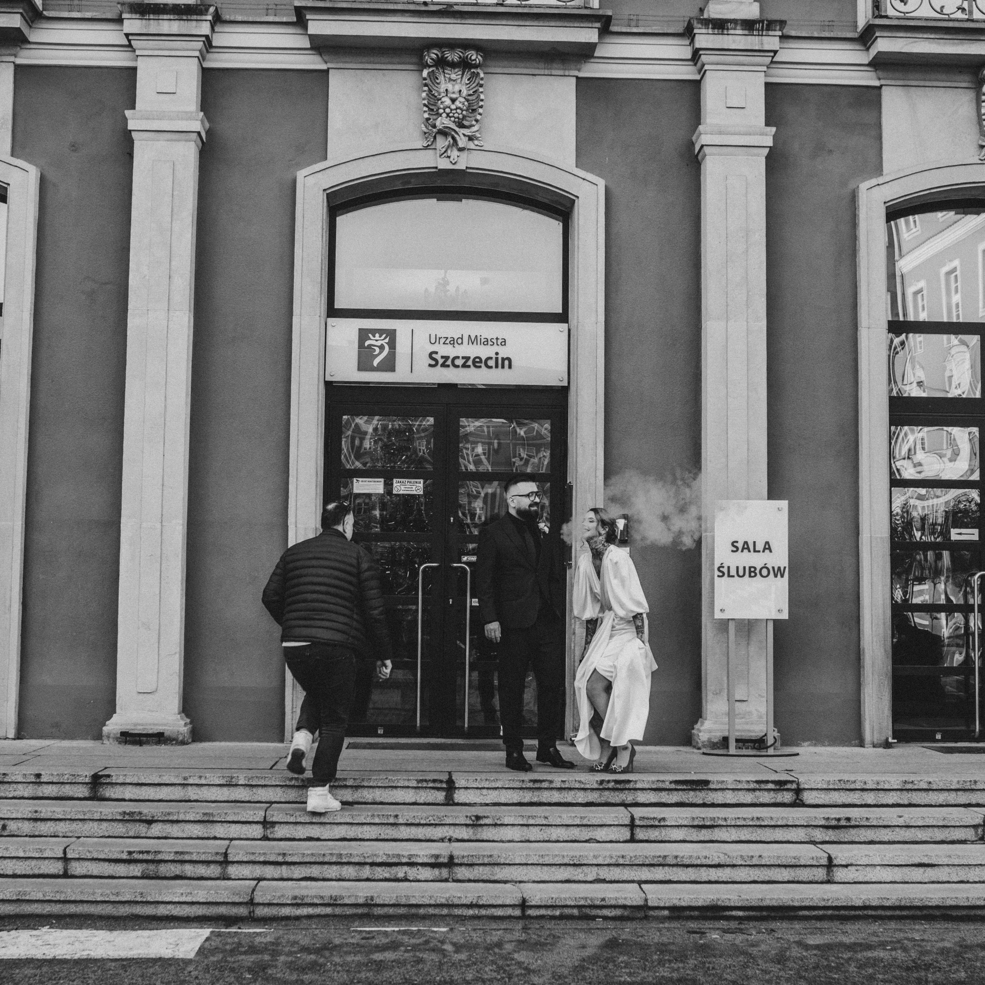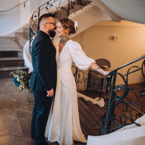 Kiedy dojechałam do USC w Szczecinie i weszłam na główny hol, zobaczyłam moją parę i poczułam, że to będzie wyjątkowy ślub. Moja para stała wraz z innymi gości i oczekiwała aż wybije odpowiednia godzina. Pomyślałam, że wykorzystamy ten czas oczekiwania na dodatkowe zdjęcia. Miałam nadzieję, że Zuzia z Pawłem poczują się lepiej, stres, który się pojawił ulotni się jak zostaną, choć na parę minut sami (z fotografem gdzieś w oddali, ale bardzo chciałam dać im tę przestrzeń). Poszliśmy na schody urzędu i zrobiłam parę (no dobra trochę więcej niż parę ;)) zdjęć mojej parze. Byli bardzo do siebie wtuleni i było widać, że oboje potrzebują tej bliskości. Mieliśmy naprawdę 5 minut z zegarkiem w ręku, więc to była błyskawiczna mini sesja, ale powiem Wam, że bardzo potrzebna.