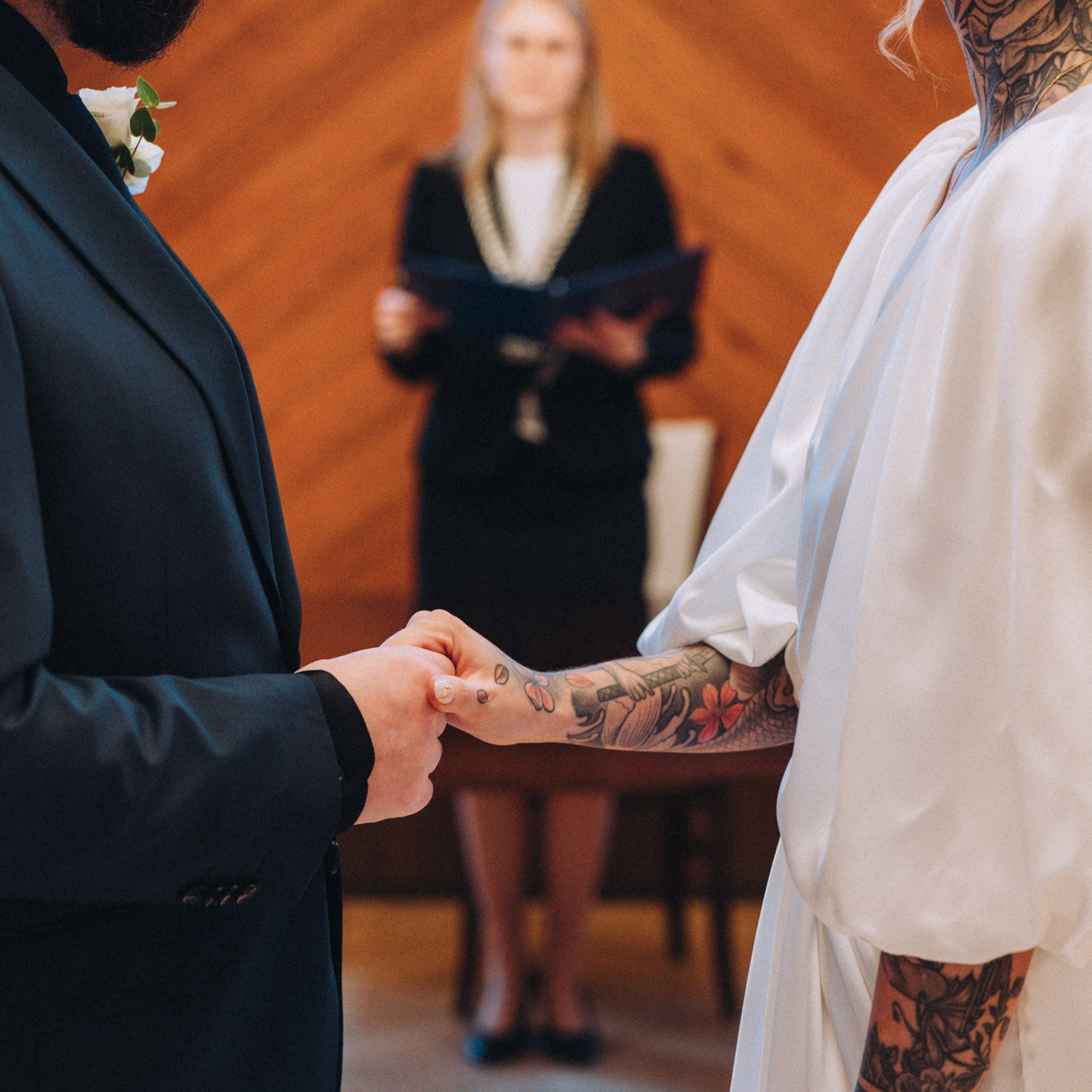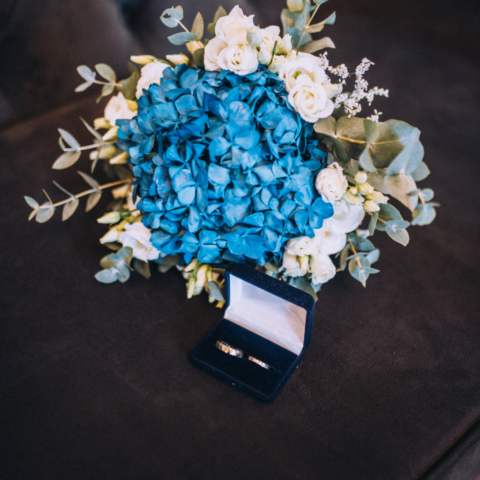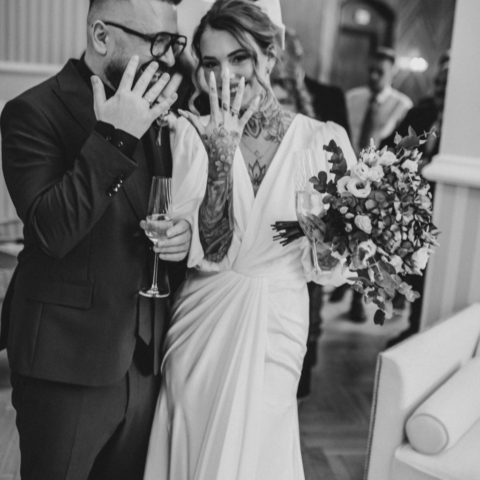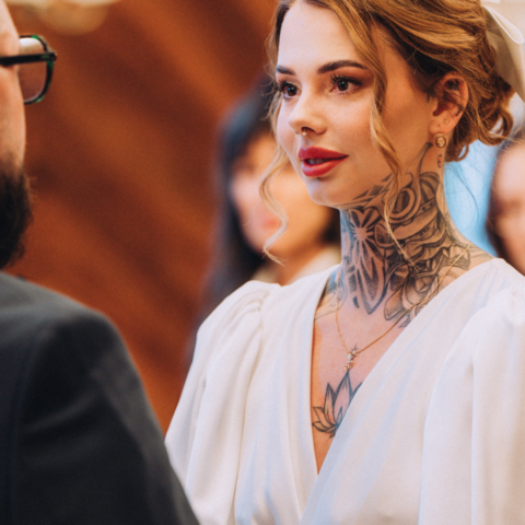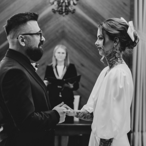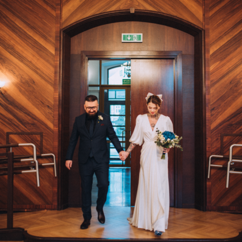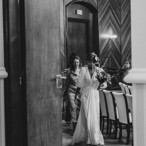 Mam wrażenie, że na twarzy Zuzi i Pawła coś się zmieniło, jakby ten stres odrobinę się ulotnił. Przyszła po nas świadkowa, że to już czas i Zuzia z Pawłem poszli do pokoju urzędniczki. Kiedy wyszli z powrotem do gości, to już był ten właściwy moment, aby wejść na główną salę gdzie miał odbyć się ślub. Ceremonia nie trwała długo, w tle przygrywał nam pan na pianinie, a Zuzia z Pawłem co jakiś czas na siebie zerkali. Kiedy urzędniczka prosiła, aby powtórzyć przysięgę, zauważałam wzruszenie w oczach Zuzi, to był przepiękny moment. Kiedy założyli obrączki, stało się, goście klaskali i cieszyli się razem z parą młodą. Przeszliśmy do pokoju toastów i tam goście złożyli oficjalne życzenia. Udało nam się zrobić wspólne rodzinne zdjęcie, ale zaprosiłam jeszcze wszystkich na zdjęcie na zewnątrz. Po kolejnym wspólnym zdjęciu dałam chwile Zuzi i Pawłowi, aby ochłonęli.