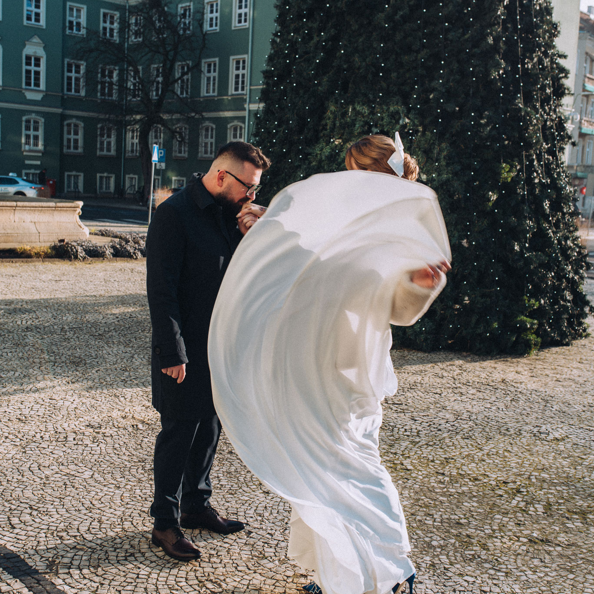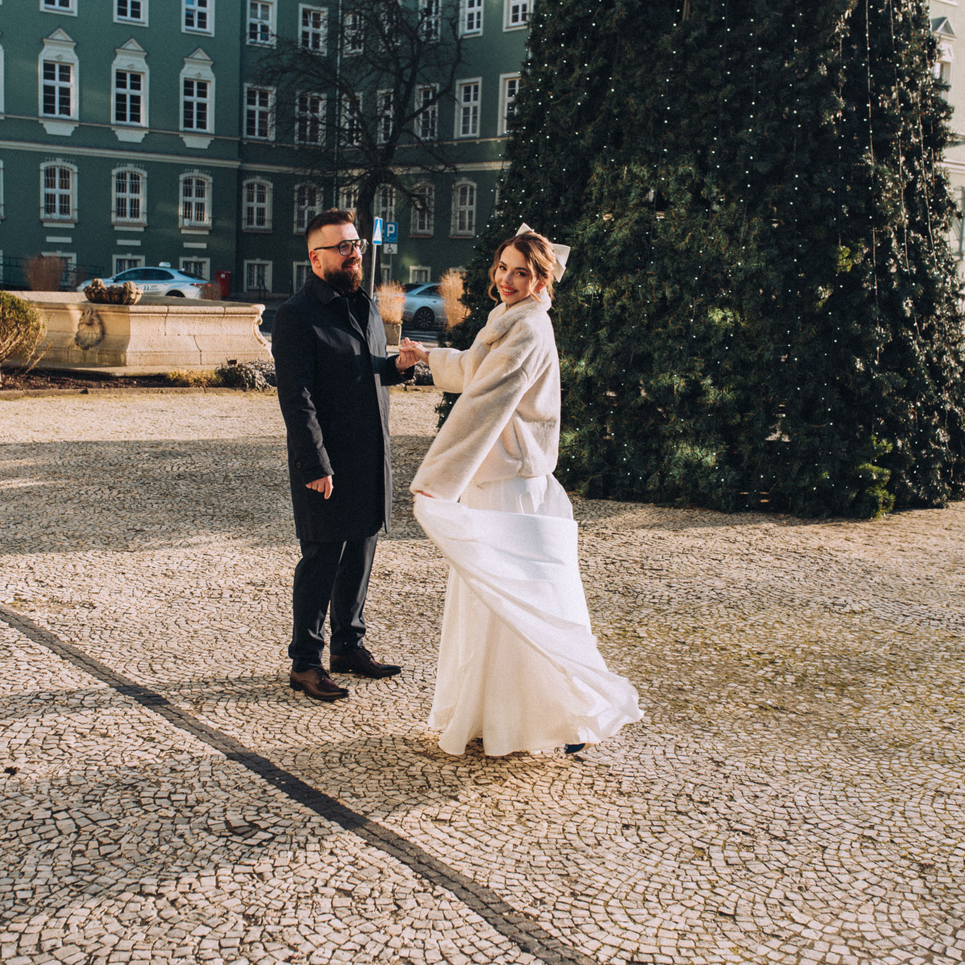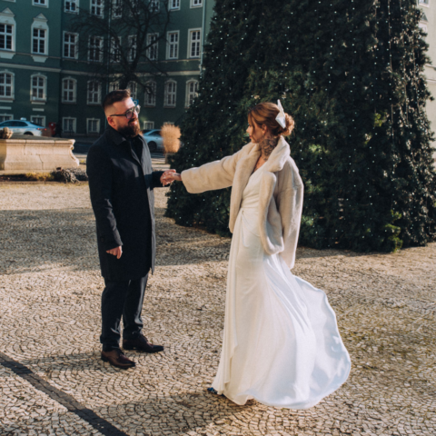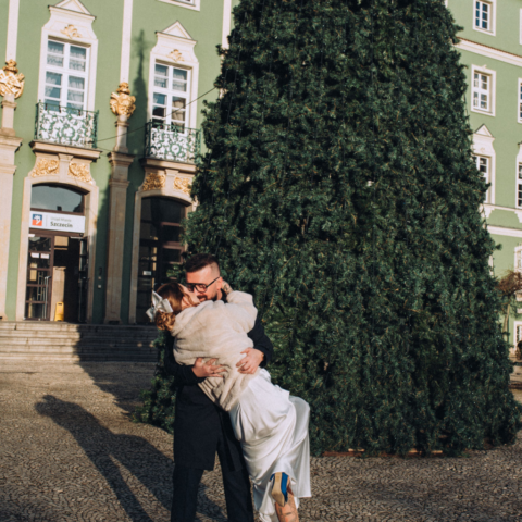 Zaprosiłam Zuzię i Pawła na kilka zdjęć, na środku placu stała ogromna choinka, był to krótki spacer, ale zrobiliśmy naprawdę dużo wspaniałych zdjęć. Od Zuzi dowiedziałam się, że lubi pozować, choć staram się uciekać od pozowania na takiej sesji poślubnej to zdecydowanie Zuzi umiejętność poprowadzenia partnera i doskonałego wyczucia przed obiektywem spowodowała, że sesja przebiegła bardzo szybko. I efekty sesji było wspaniałe. Zapraszam Was do obejrzenia zdjęć poniżej.