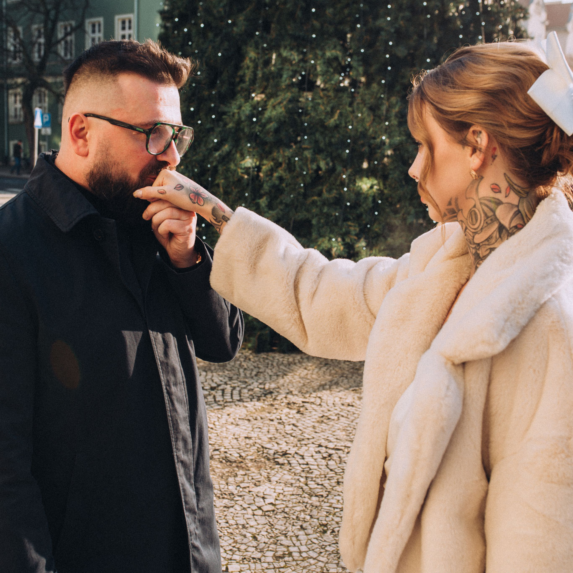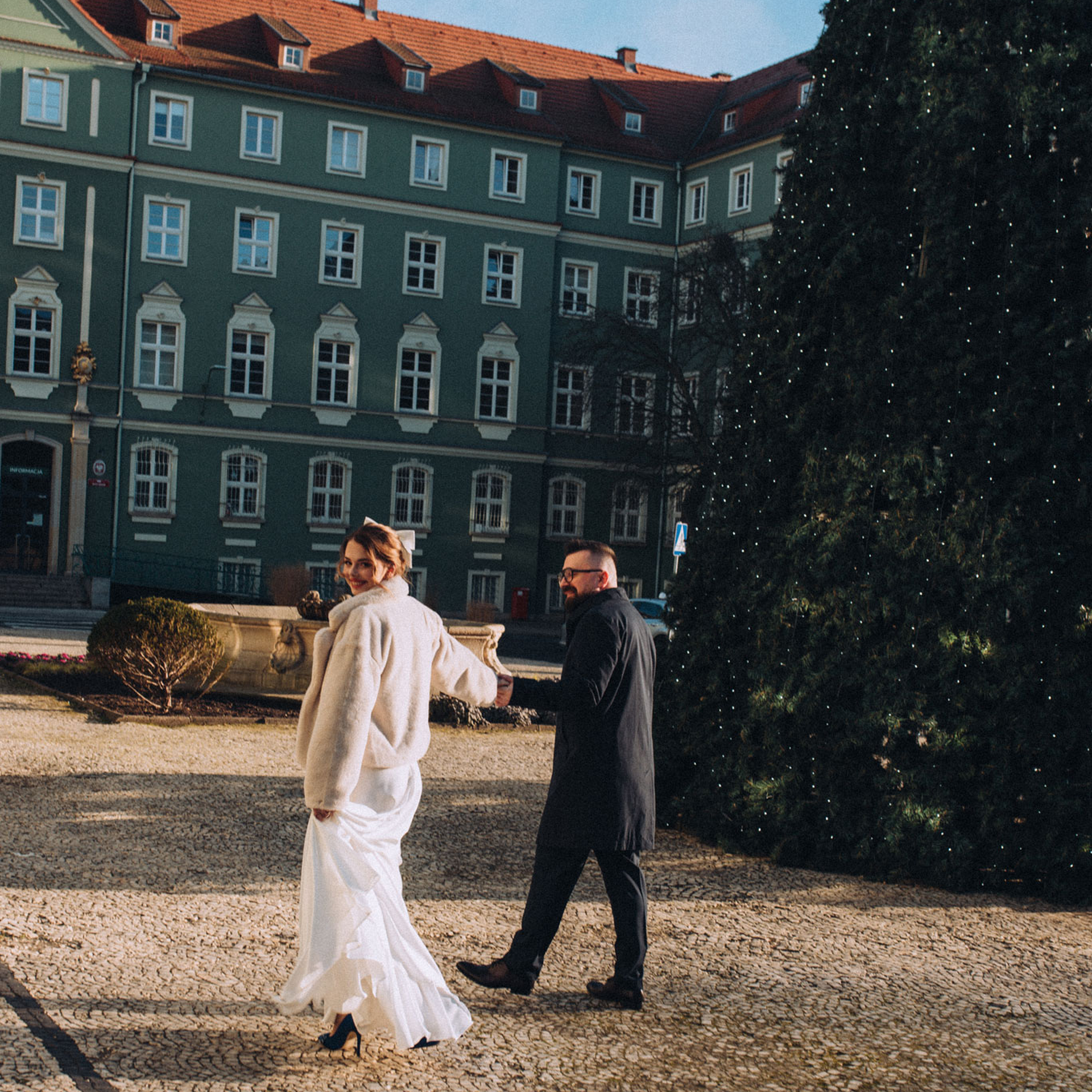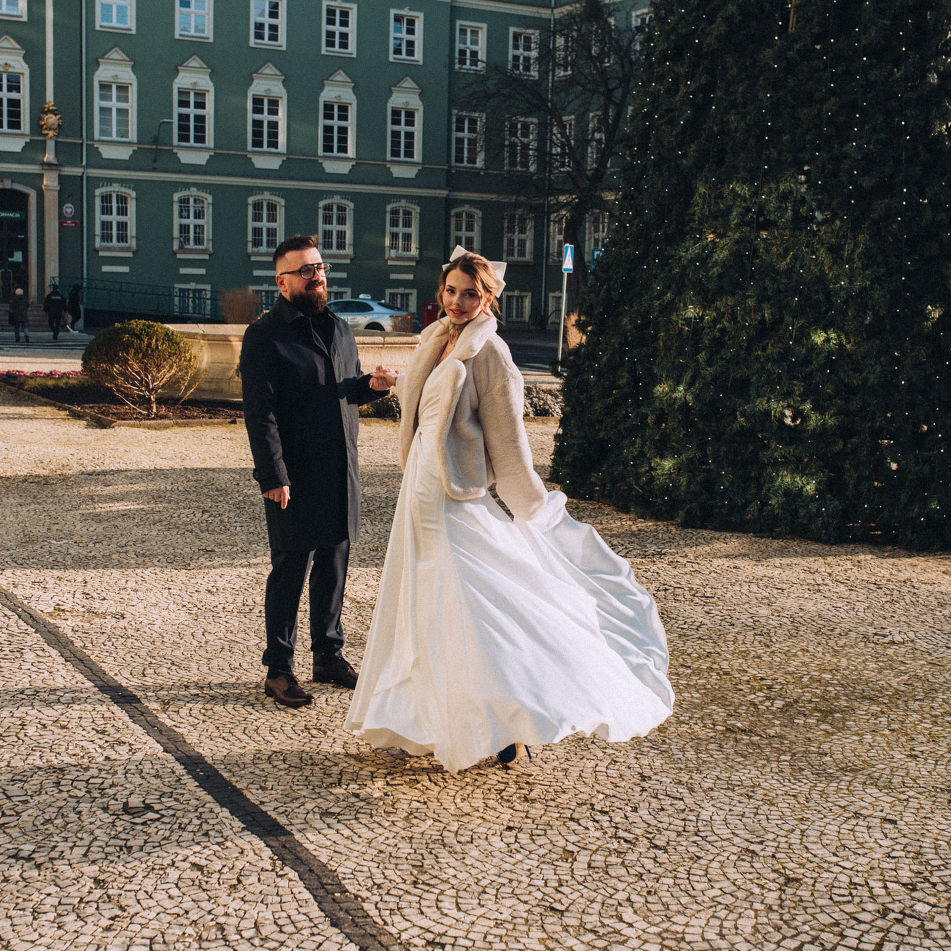 Zaprosiłam Zuzię i Pawła na kilka zdjęć, na środku placu stała ogromna choinka, był to krótki spacer, ale zrobiliśmy naprawdę dużo wspaniałych zdjęć. Od Zuzi dowiedziałam się, że lubi pozować, choć staram się uciekać od pozowania na takiej sesji poślubnej to zdecydowanie Zuzi umiejętność poprowadzenia partnera i doskonałego wyczucia przed obiektywem spowodowała, że sesja przebiegła bardzo szybko. I efekty sesji było wspaniałe. Zapraszam Was do obejrzenia zdjęć poniżej.